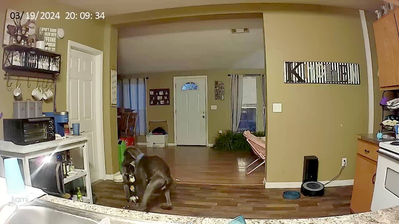 A woman asks her dog what he did while he was home alone in a kitchen, then shows that he has ripped apart and ruined the window blinds. The dog squeaks a toy and wags.
