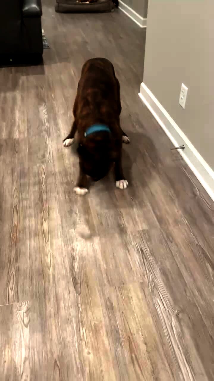 A boxer dog's whole body shakes when he sneezes in the living room.