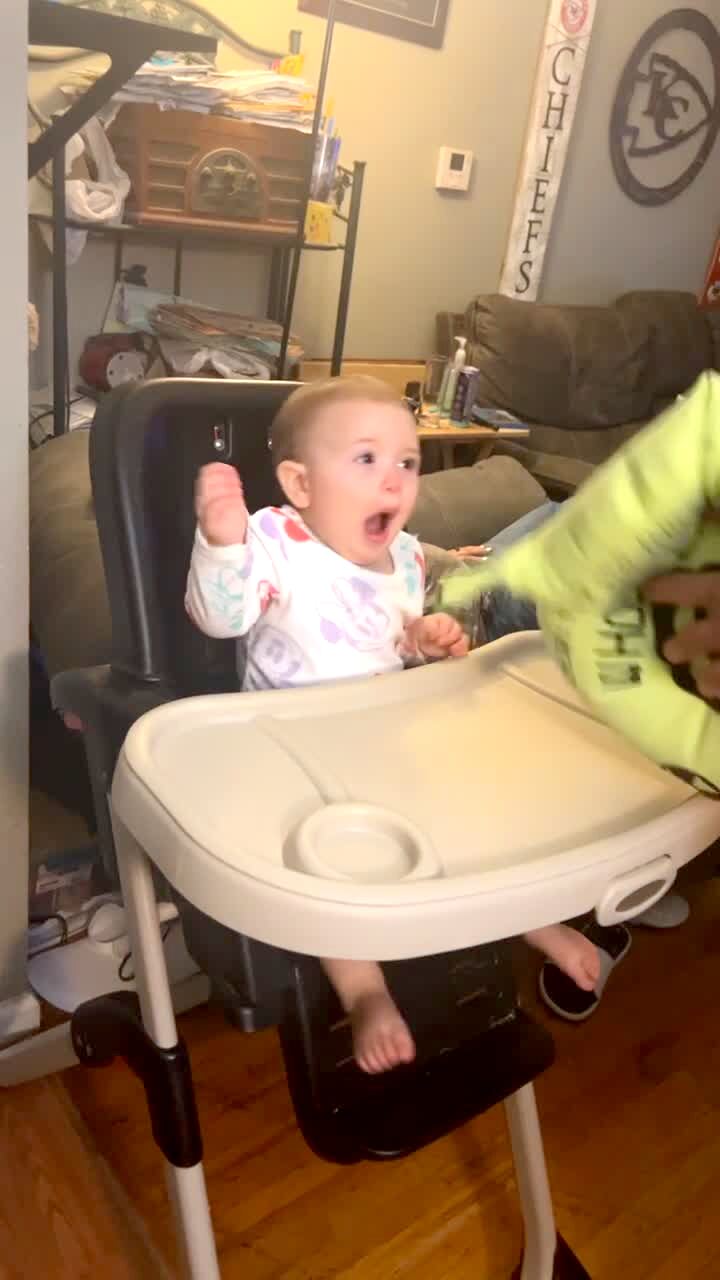 A man deflates a whoopee cushion in a baby's face. The baby makes a series of confused and surprised faces as air is blown in her face.