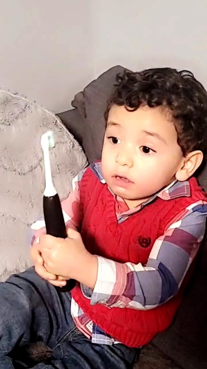A young boy holds an electric toothbrush and it vibrates and he shakes vigorously and groans in the living-room.