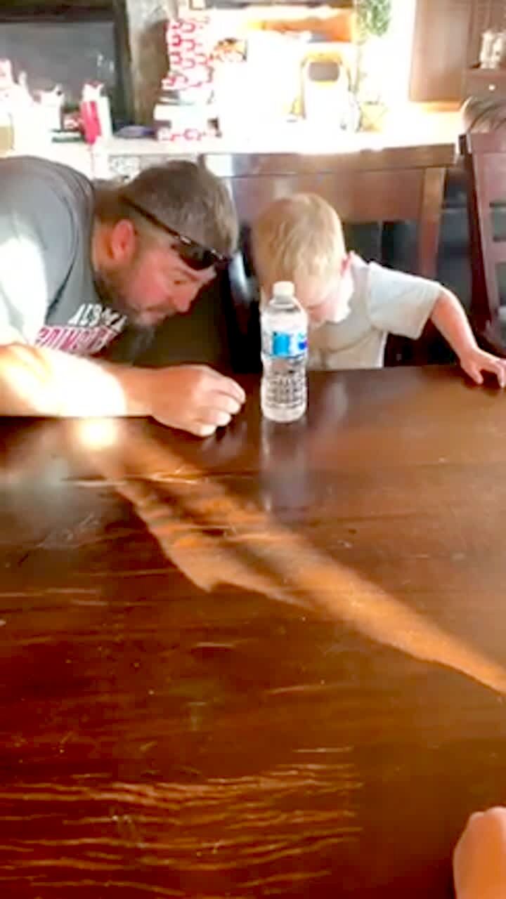 A man tries to prank his tot son with the coin in the water bottle trick, but when he squeezes the bottle, the water goes in his face.