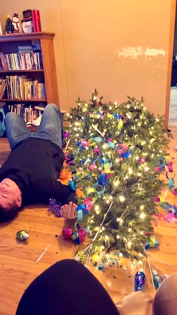 A man rides a hoverboard in the living room and falls over, knocking down the Christmas tree.