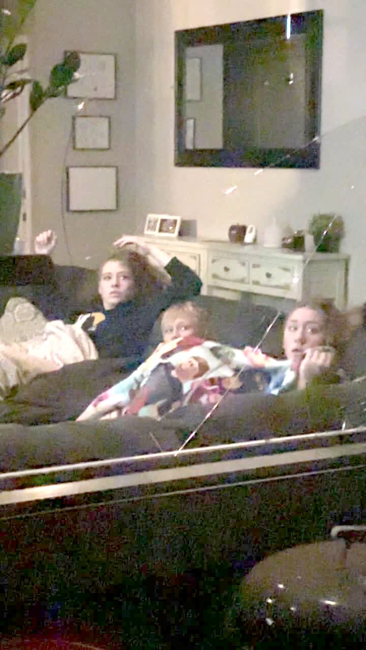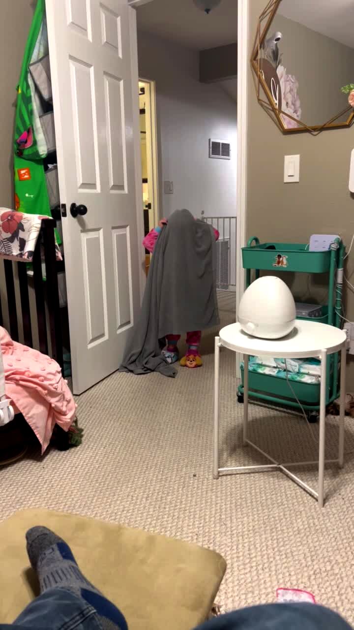 A young girl claims she can disappear. She puts a blanket over her head and when a woman counts to three, the daughter tries to run behind the wall but runs into the door instead. She then runs away and pretends nothing went wrong as the mom and dad laugh.