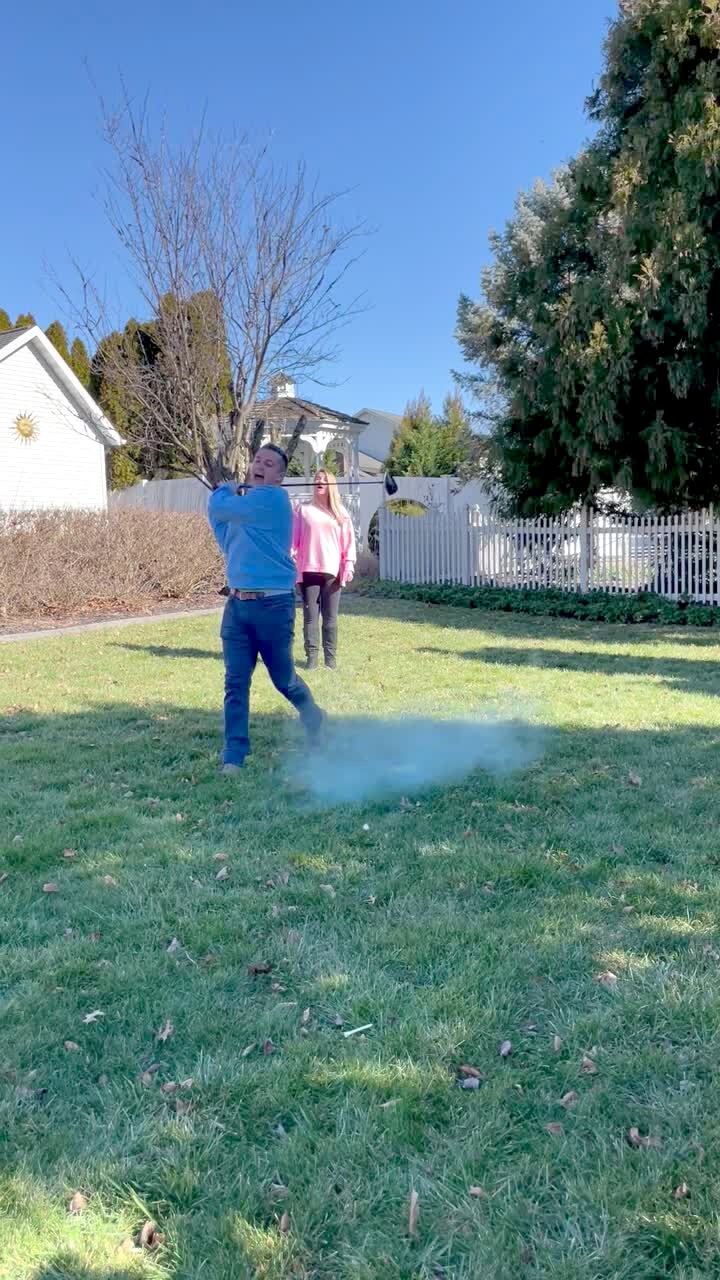 A man swings a golf club for a gender reveal. He screams in excitement and tosses the club when he sees that it will be a boy. The golf club hits his pregnant wife on the backswing and she falls down.