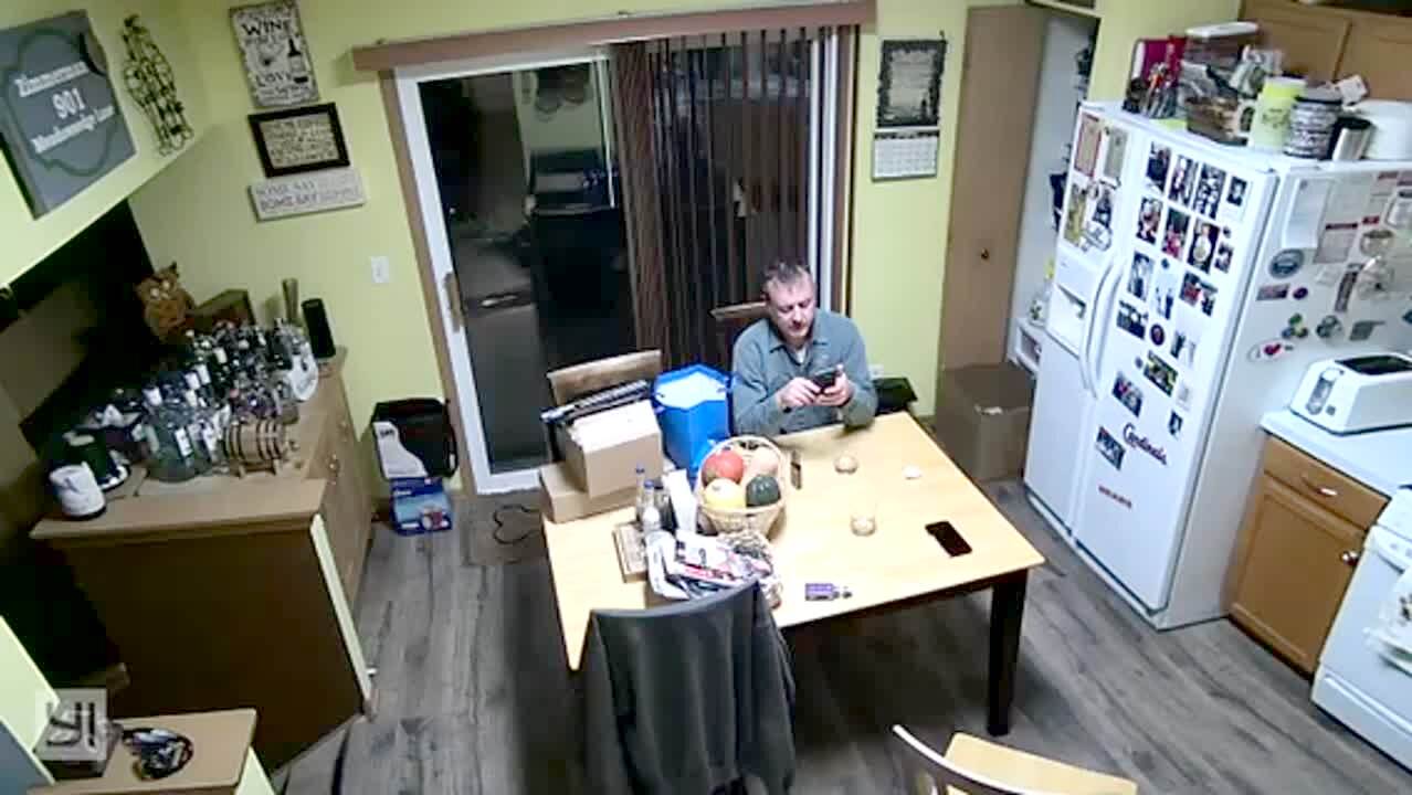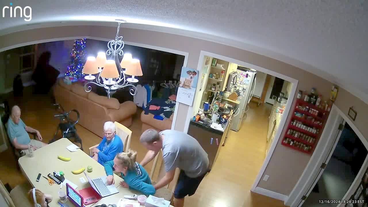 A man sneaks up on his wife and tickles her while she works on her laptop at the dining room table, then they hit their heads together when the woman jumps. Security footage.