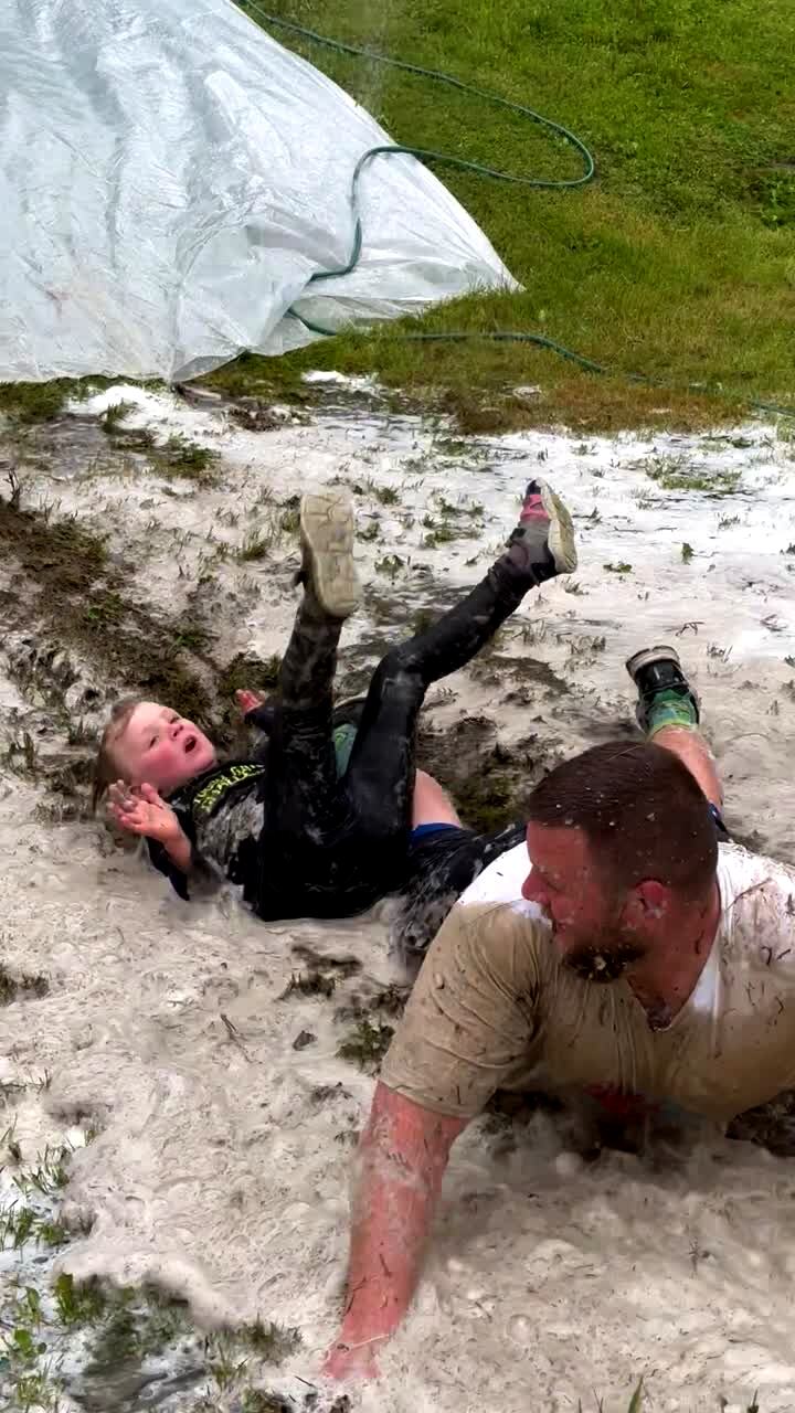 A young girl slides down slip and slide then a man comes down after her and knocks her into the mud. Featured talent cleared only (the man and the little girl).