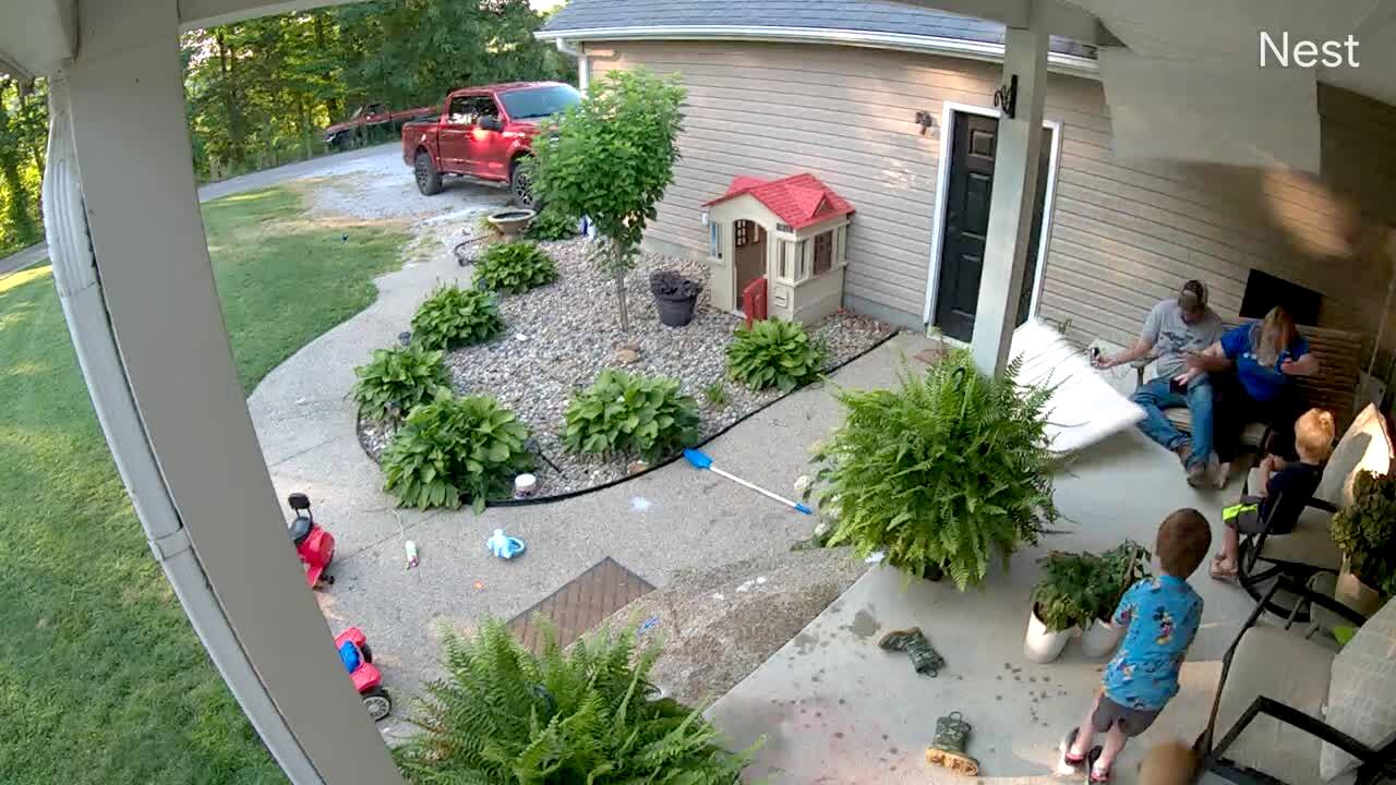 A man in a yard bounces a tennis ball off the roof of the house. A German shepherd dog on leash runs after the ball, and the woman who holds the leash falls down. Security footage.
