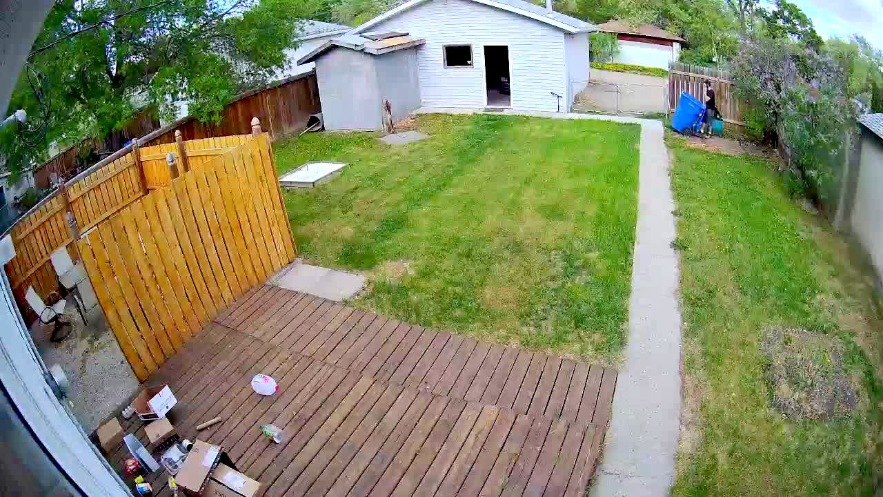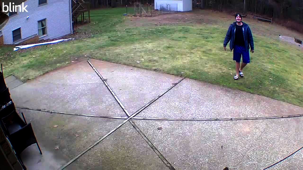 A man talks on a phone as he pushes a recycling bin in a yard and slips and falls and lands face first on the bin. Security camera.