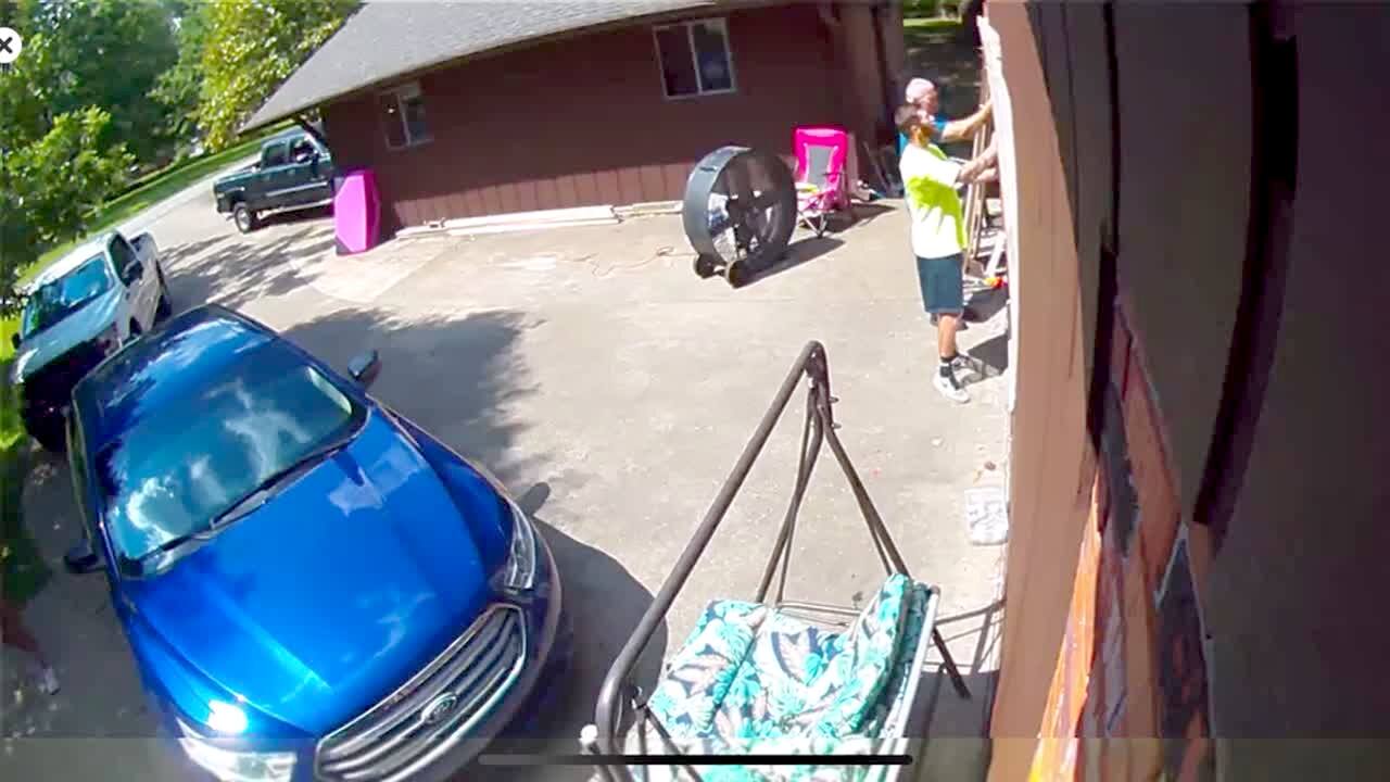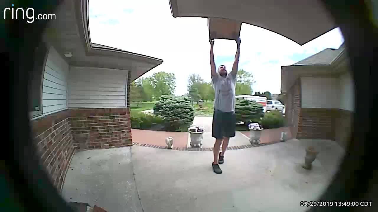 A man in front of a home tries to catch a desk from the second story as someone else lowers it down to him. It drops down and hits him on the head and falls and breaks on the ground. Security camera.