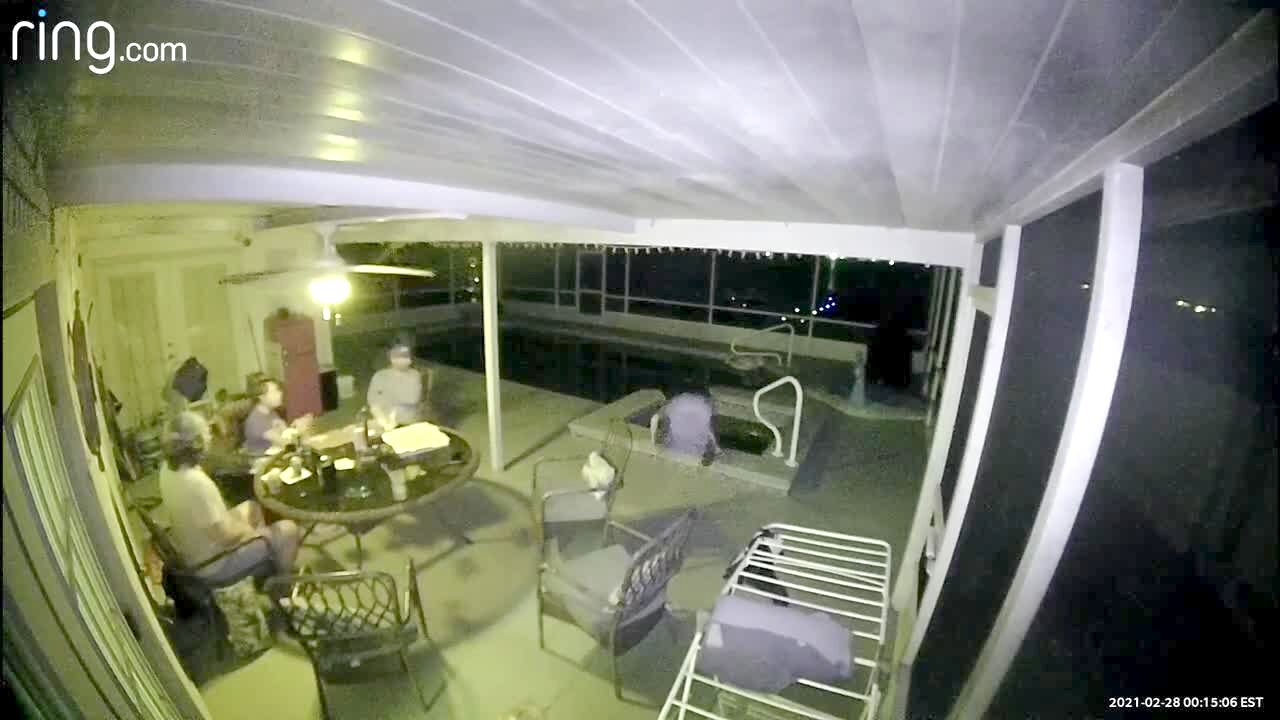 A man and woman sit on porch swing. The man adjusts himself to fart and the swing breaks causing both of them to fall down. Security footage.
