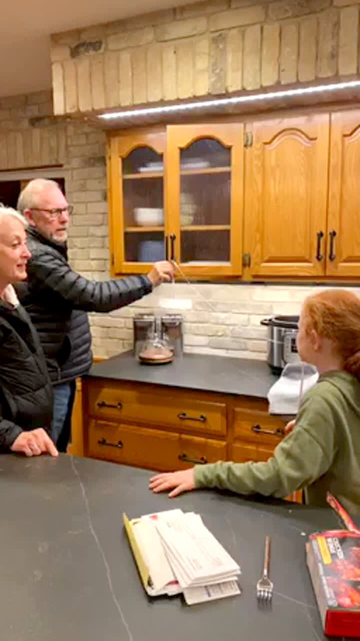 A man swings a kitchen cabinet closed to pull a young girl's loose tooth out with string, but the glass on the cabinet breaks and the girl's tooth does not come out.