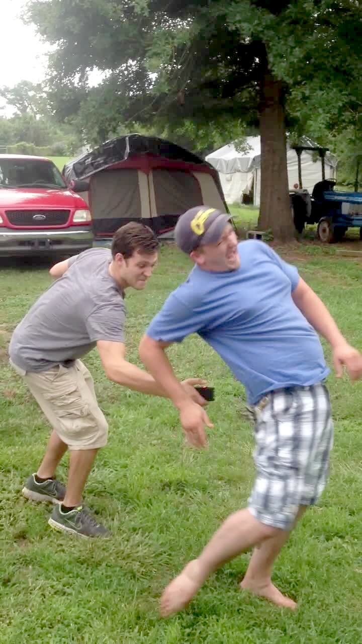 Man shocks himself with dog collar. Has a huge reaction and falls to floor.