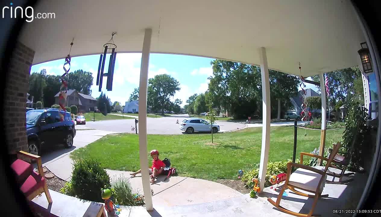 A young boy loses control of his hoverboard in a yard, as he sits and spins in circles. Security footage.