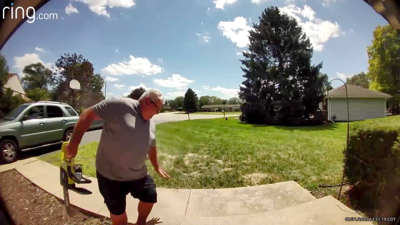 A man holding a chainsaw rings a doorbell and asks for a band-aid. He then trips and falls backward in the yard. Security footage.