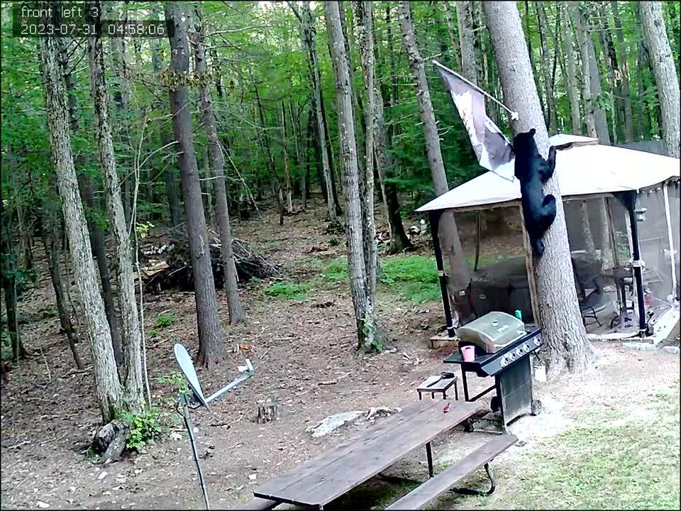 A black bear climbs up a tree in a yard and straightens a tangled, hanging flag then climbs back down. Security footage.