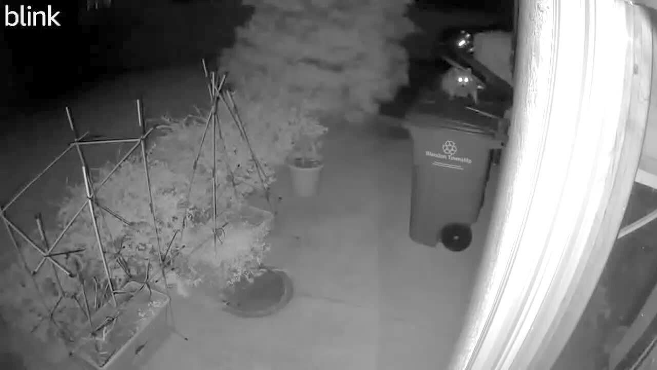 A woman says "get out of there" in a yard through a security camera, then a raccoon pops its head up from inside a trash can and leaves. Security footage.
