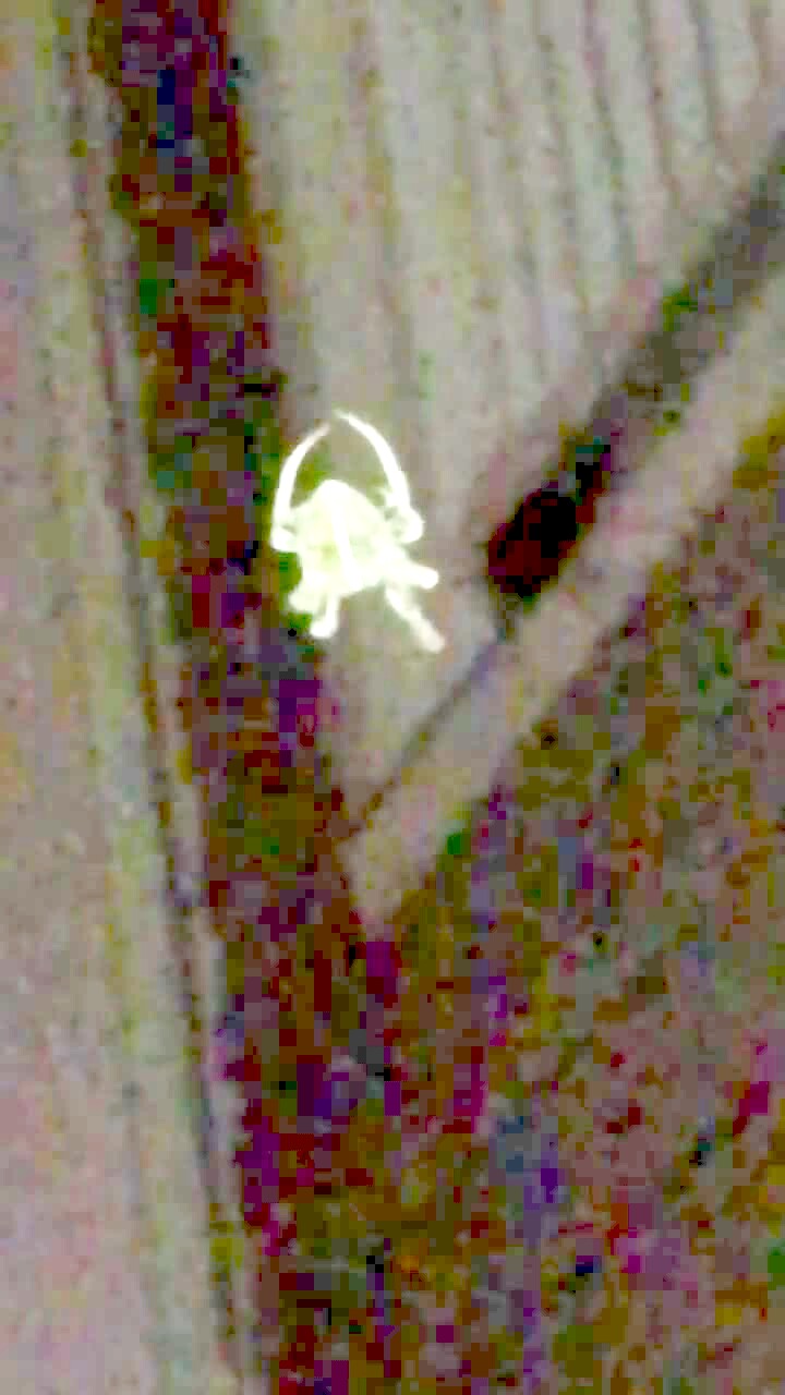 A man recording in night vision zooms in on a large spider bug that builds a web on a porch, then the spider bug jumps at the camera, and the man falls off of the porch. First person POV.