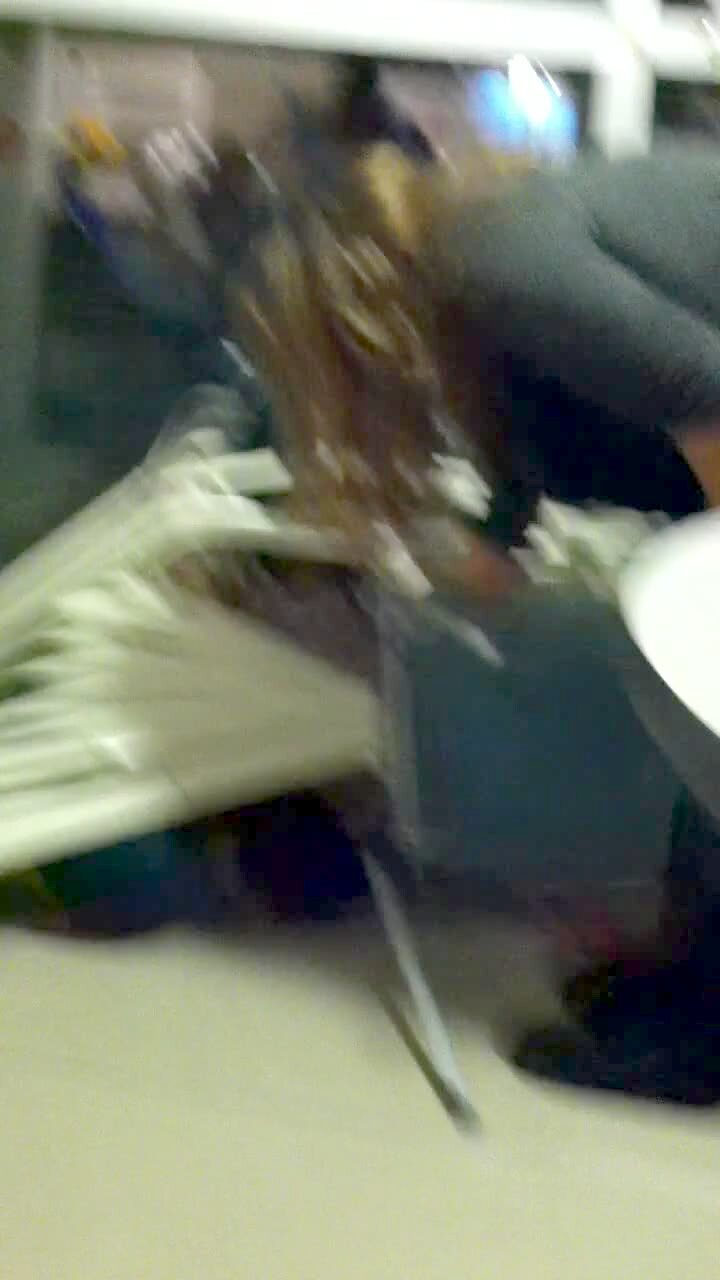Two women dance to a pop song (Blurred Lines) in a parked car and one falls out at :11.