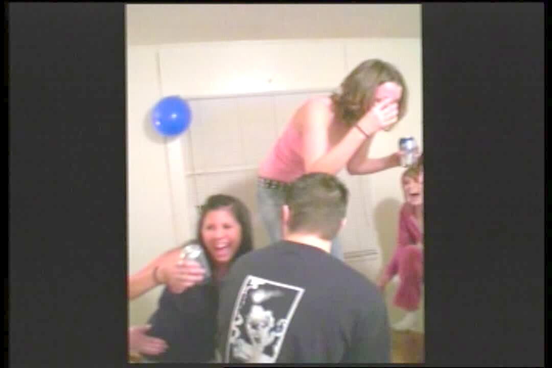 Two women dance in a living room to "Happy Birthday To You". One woman slips and falls backward on the floor. The other woman laughs hysterically and lays on the floor.