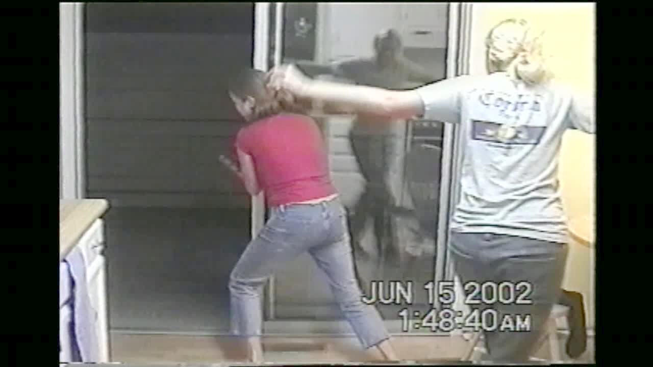 Two women dancing, one flies into sliding glass door head first. teen girls, fall, dance