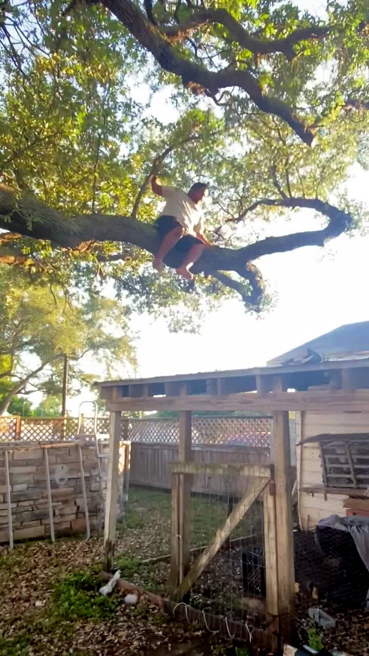 A man tries to climb from a tree branch to a roof in a yard, but he falls and hits the ground.