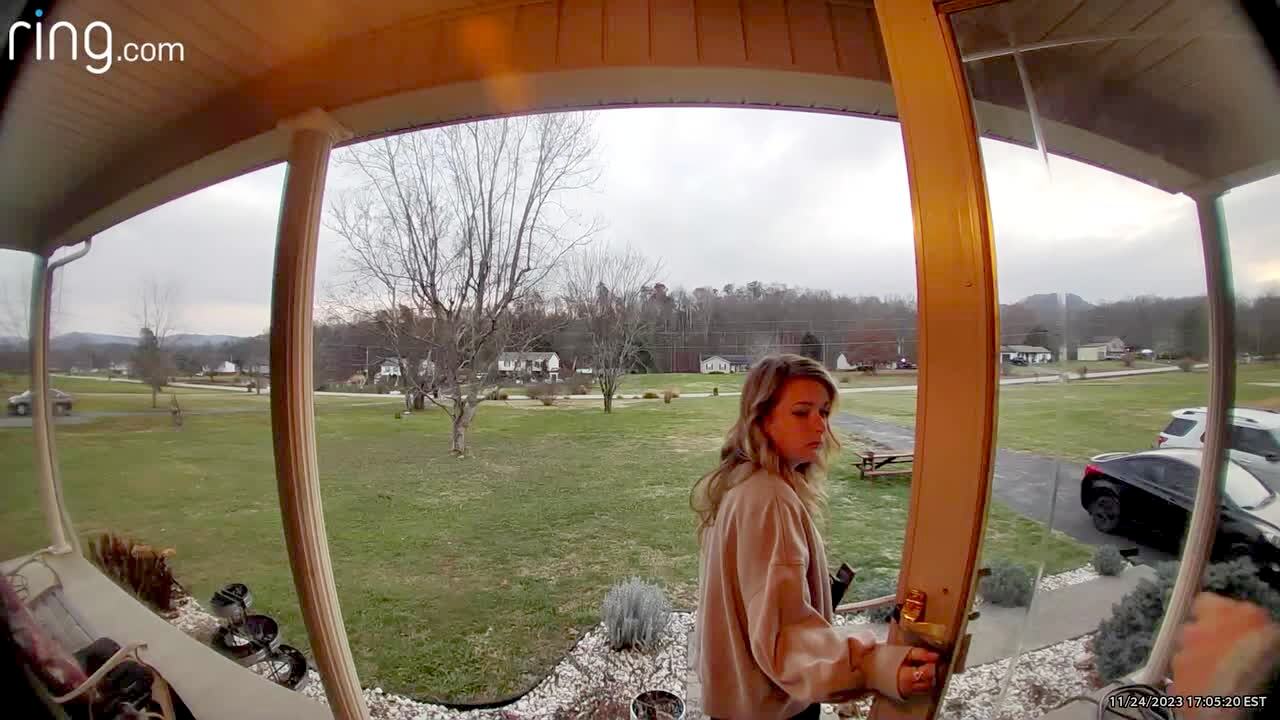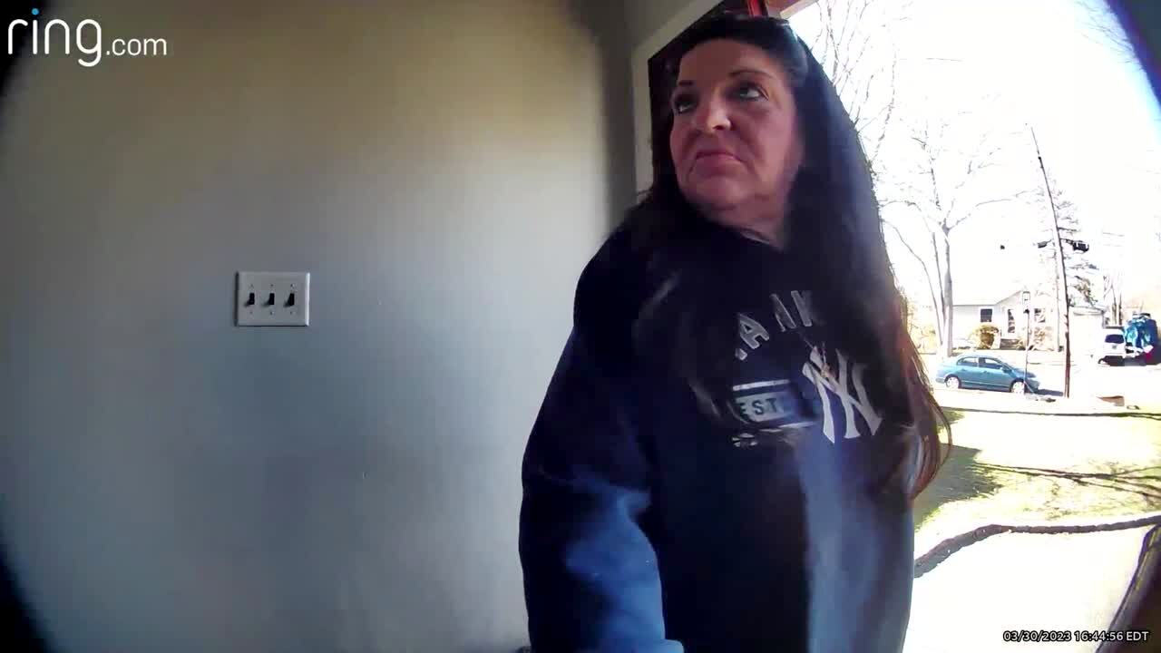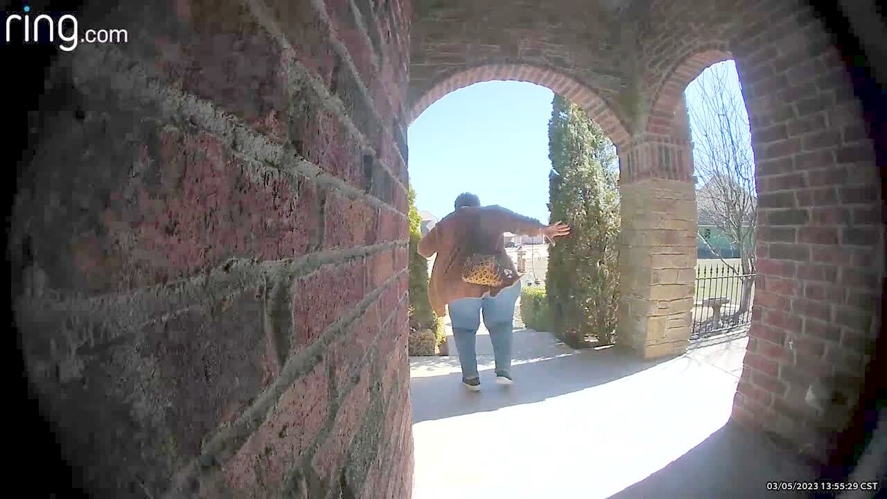 A woman walks out the front door of a house, then she trips over her own purse strap and spills the contents in the driveway. Security footage