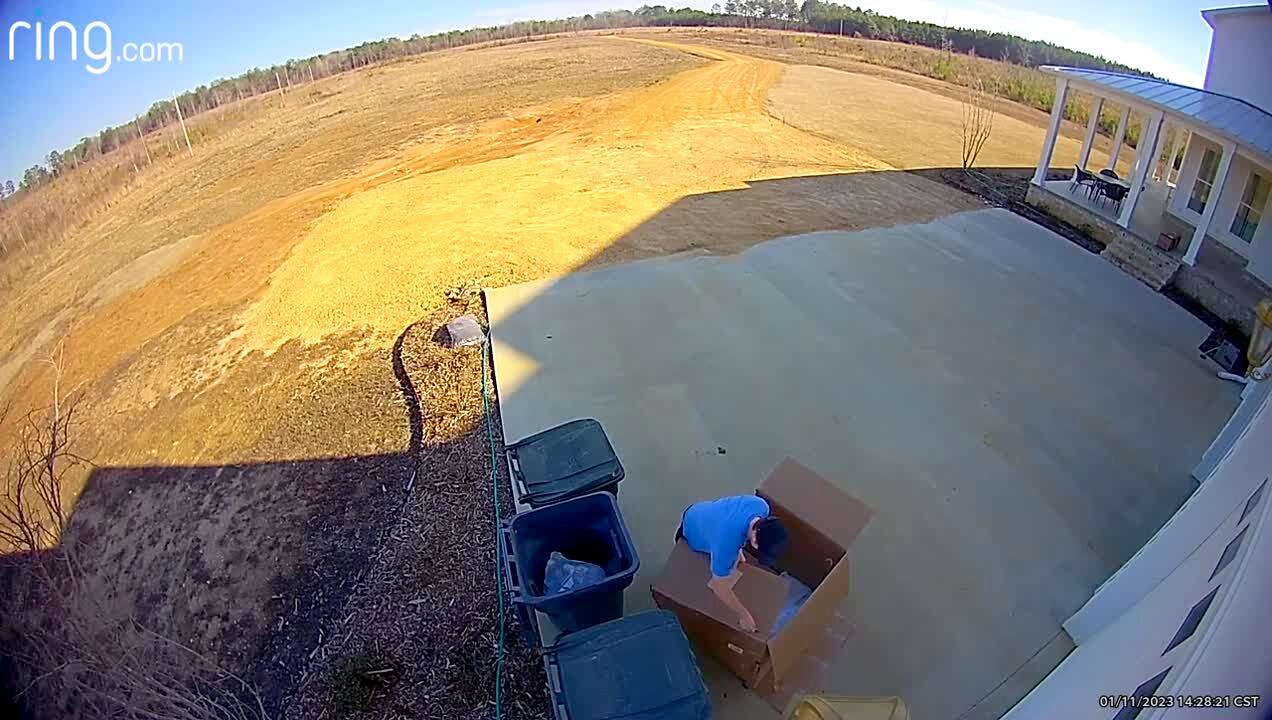 A man pushes a large box over to recycle bins on a driveway, then takes part of it off to put in the bin. He climbs all the way into the large box, then falls and says "I'm okay." Security footage.