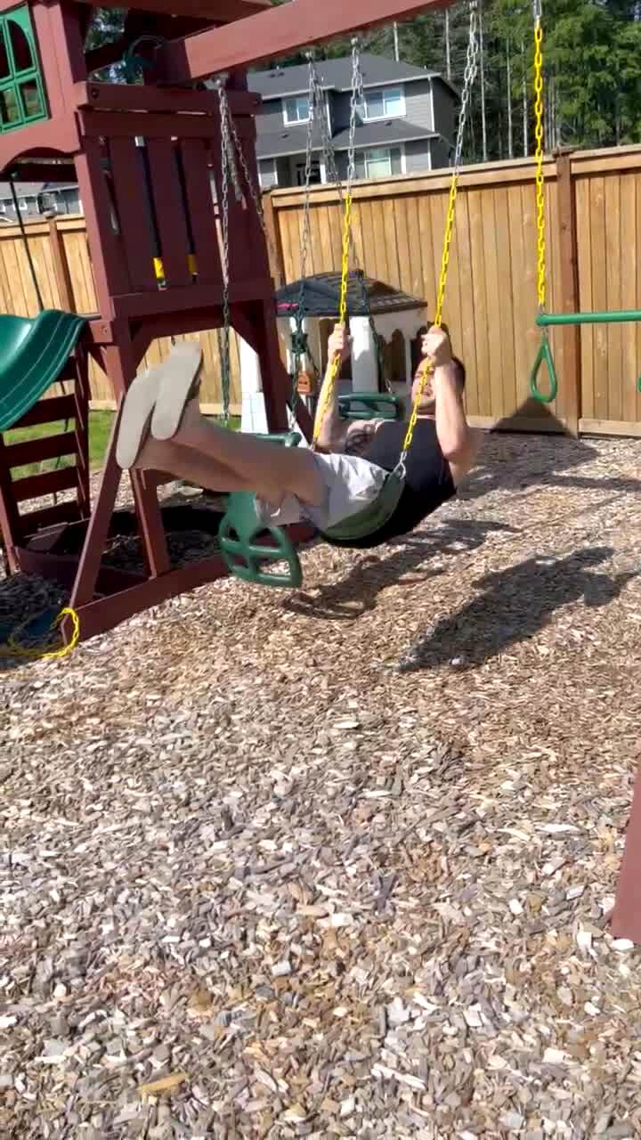 A man swings on a swing set in the backyard and does a flip off of the swing, landing on his butt.