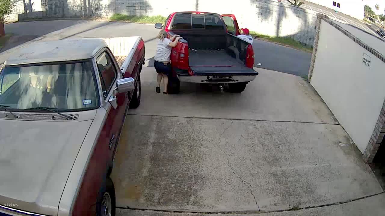 A man and woman chase a pickup truck while it rolls down a driveway, then it crashes into a wall, and the woman falls down.