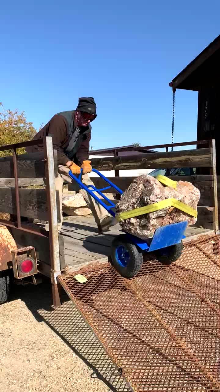 A man tries to wheel a stack of boulders down a ramp with a dolly, but he loses control and falls.