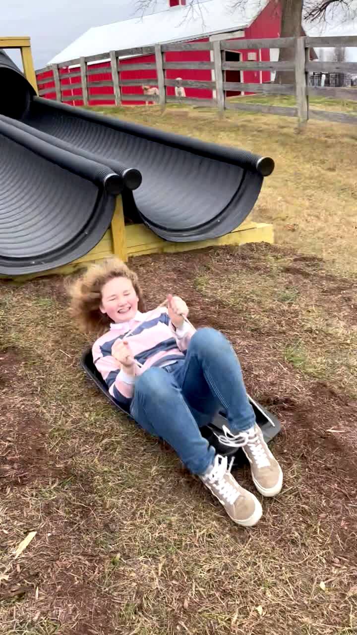 A young girl speeds down a slide on a sled, then crashes outside while her mother laughs.
