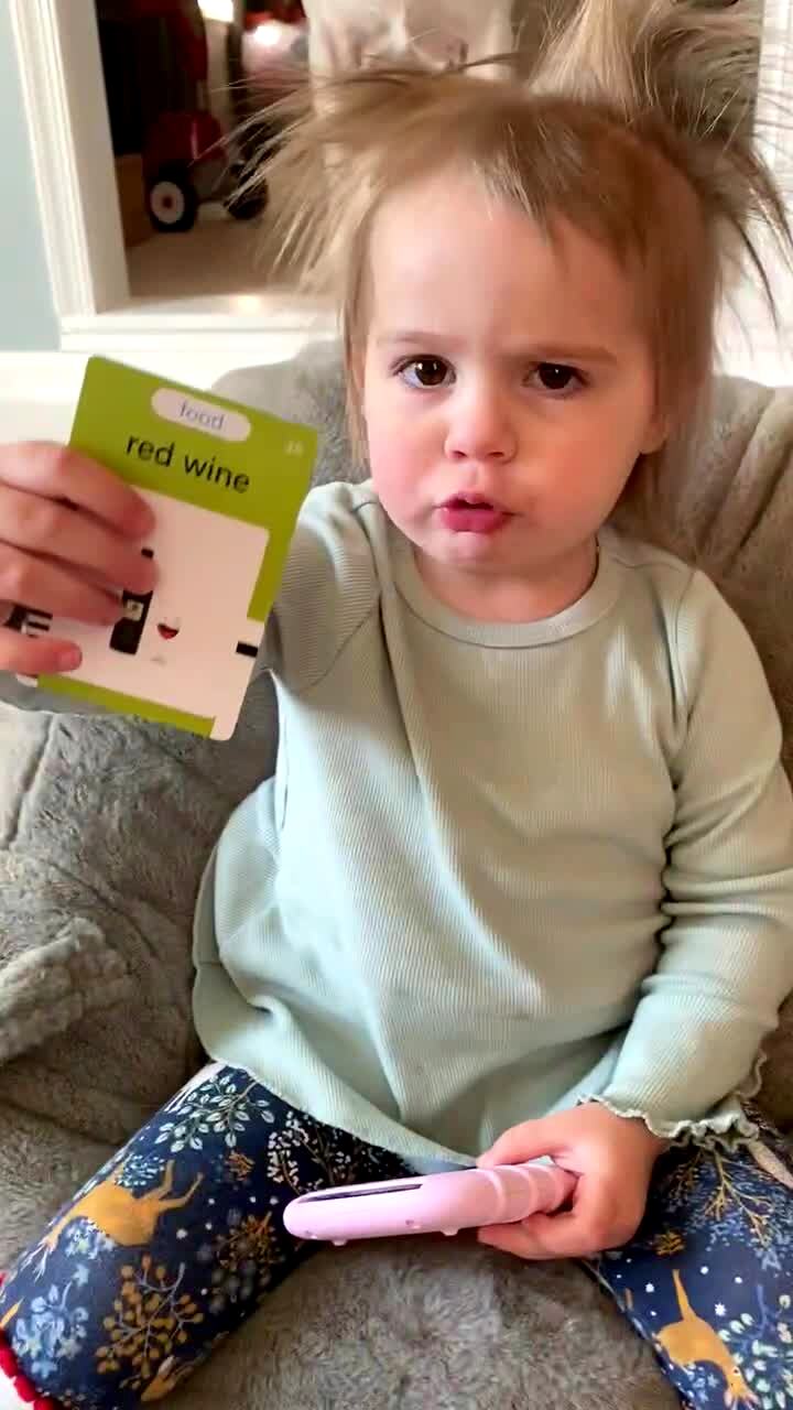 A young girl holds up a flash card that has a bottle of wine on it and she says "that momma juice" while her off-camera mother laughs.
