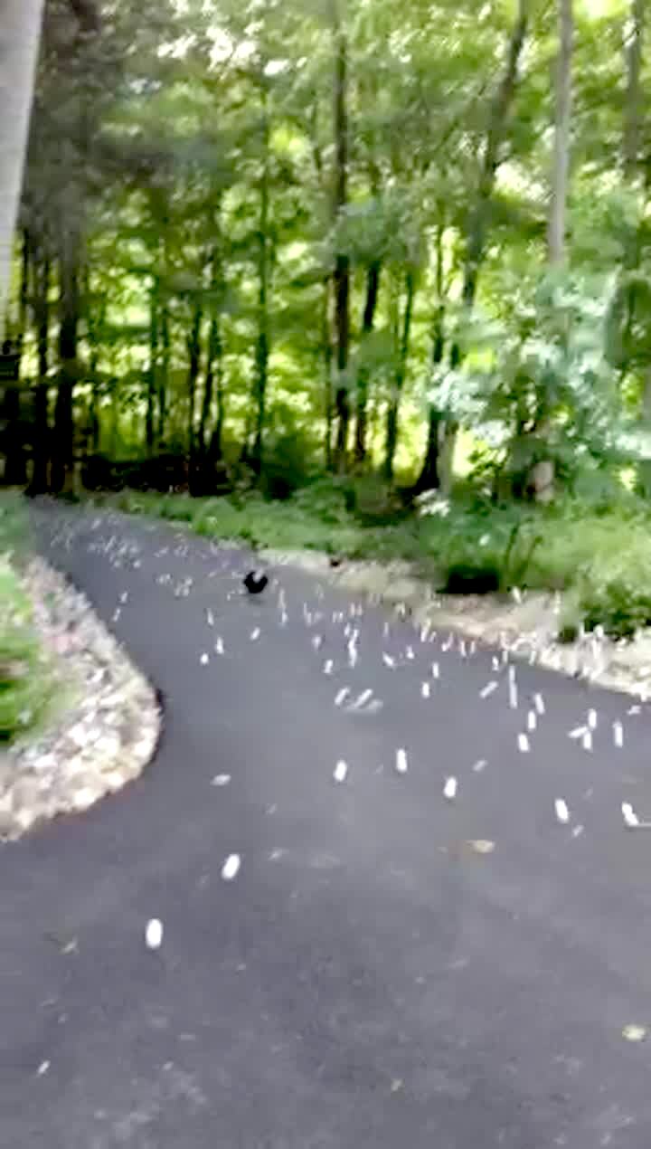 A woman opens an SUV trunk and thousands of golf-balls pour out and bounce and roll down the driveway.