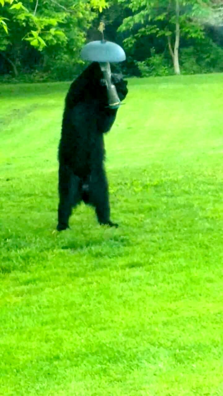 A man uses a spray bottle on a porch and trips and falls off the porch into a bush. Security footage.