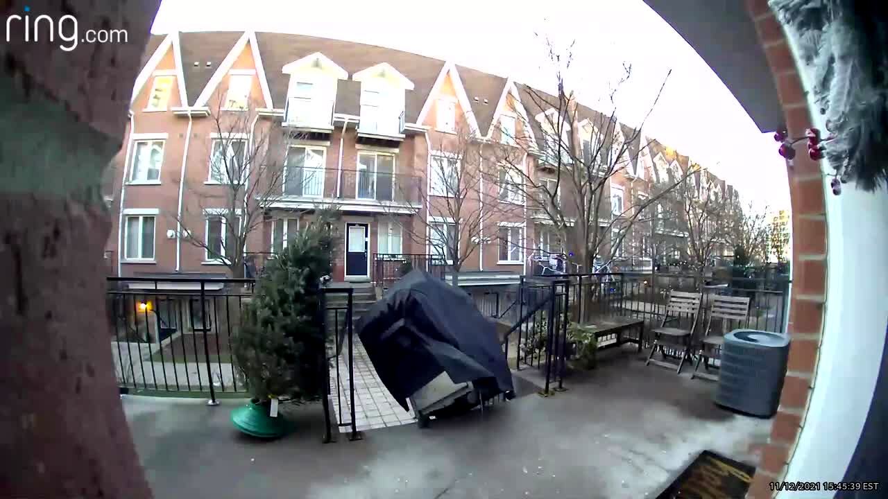 A woman tries to open her umbrella to go out in the rain in a yard, but the umbrella pops off of its handle and falls on the ground. Security footage.