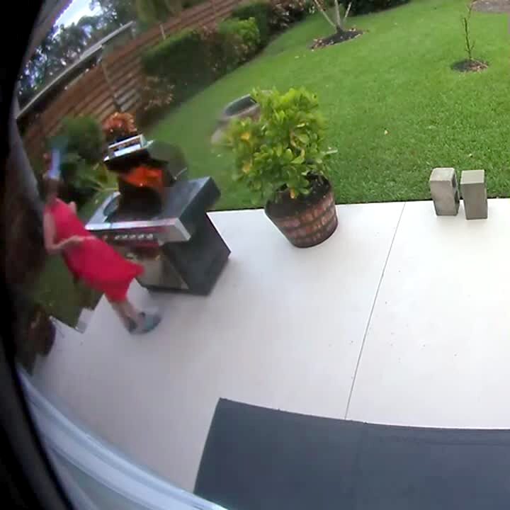 A woman walks onto a yard and opens a barbecue grill, then flames rise up out of it, and her hair smokes. Security footage.