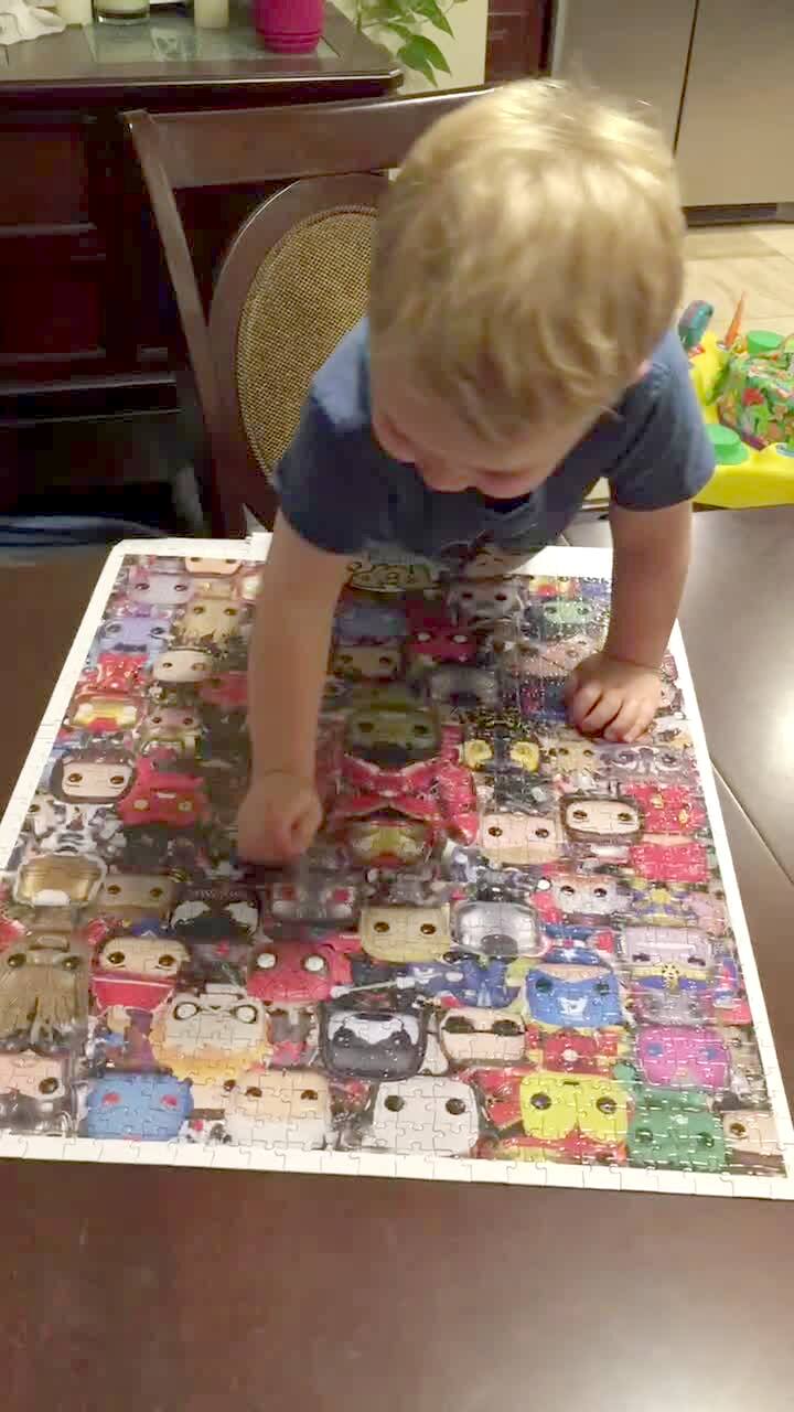 A tot boy climbs on a table and put the last piece of a large puzzle in and celebrates and falls off the table and drags the puzzle with him in the dining-room.
