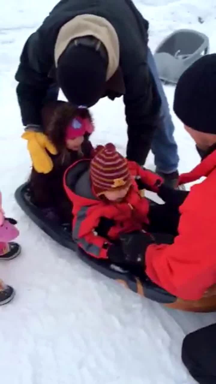 A tot girl and tot boy sled outdoors while a man sleds next to them and falls in the snow. The tots almost crash into two boys and into a fence, but the man intercepts them. Another man is visible, and a man is audible.
