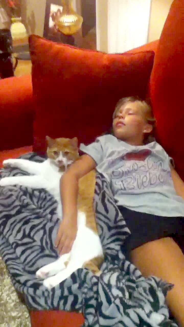 A girl sleeps on the couch indoors with her arm over a cat and the woman behind the camera sneaks up on her and screams, causing the girl to make a comical face with her hands stretch over her head. Scare.