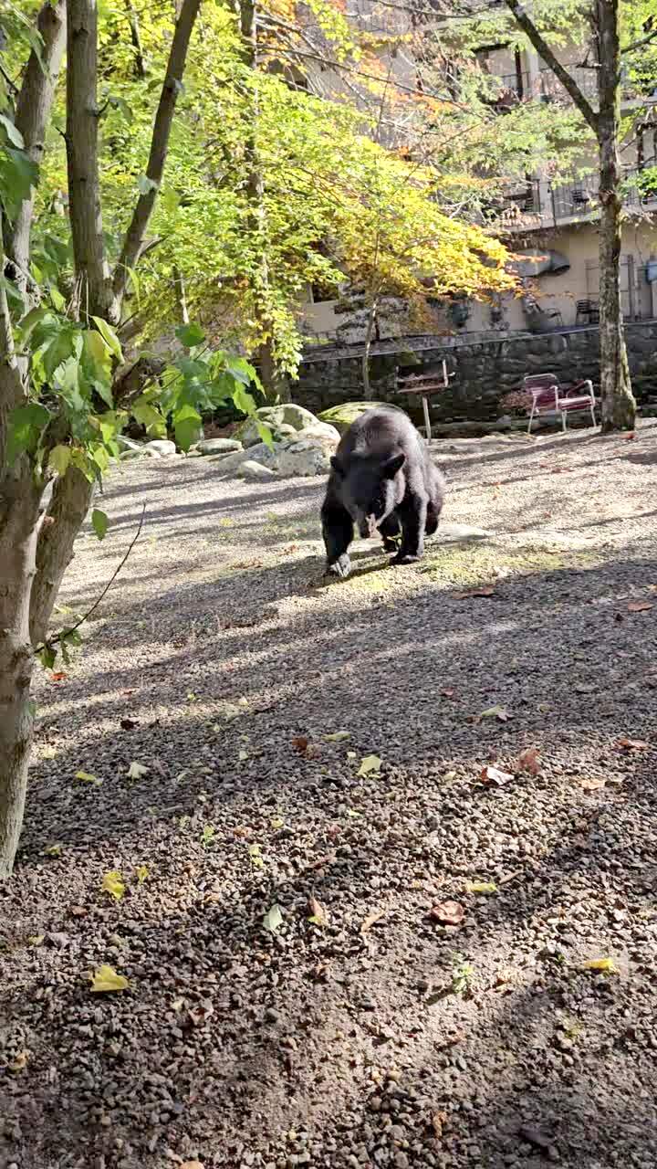 A bear walks a few feet from the camera and an off-camera woman says "Sweetie" over and over to her husband to come back inside before the bear acts like it is going to attack and walks away.