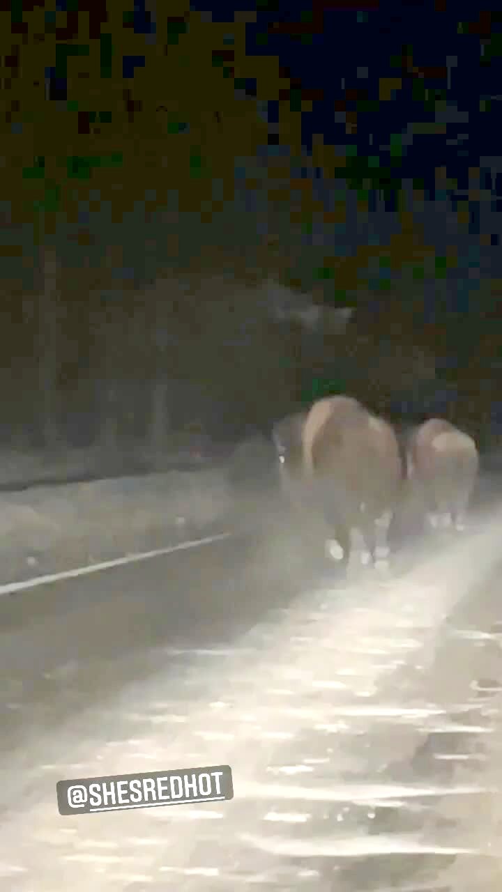 A woman drives behind a herd of buffalo on the road and they turn and run towards her and hit her car.