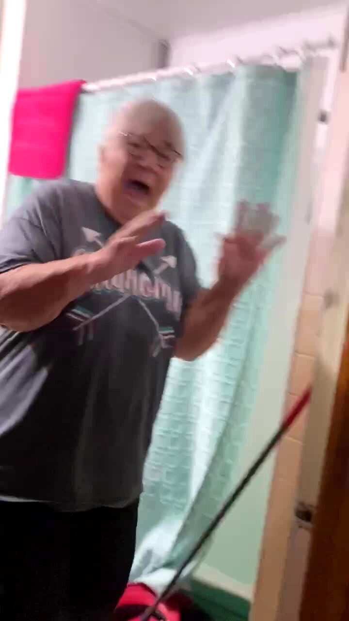 A woman scares a senior woman in the bathroom who is startled and shouts "God Bless America" instead of cursing.