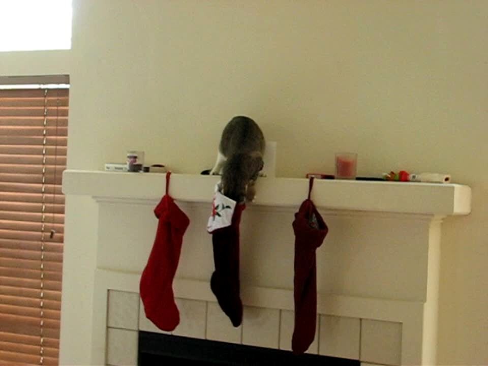 A cat tries to climb into a Christmas stocking hanging over a fireplace in a living room and falls off to the floor.