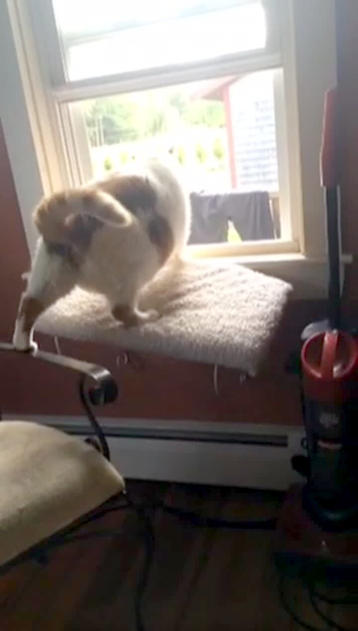 A cat stands on top of a curtain rod at home, then part of the rod breaks off, and the cat hangs from it while a woman gasps and laughs at him. He falls to the ground and walks away.