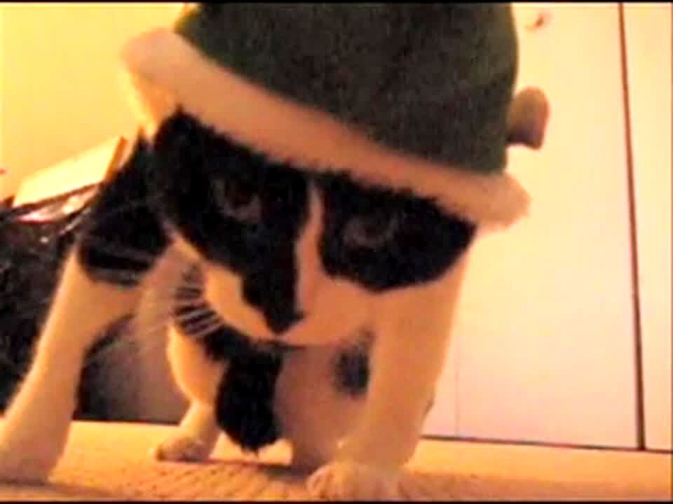 A cat wears a Santa Clause costume indoors and he kicks his legs to get it off which makes the Santa look like he's dancing.