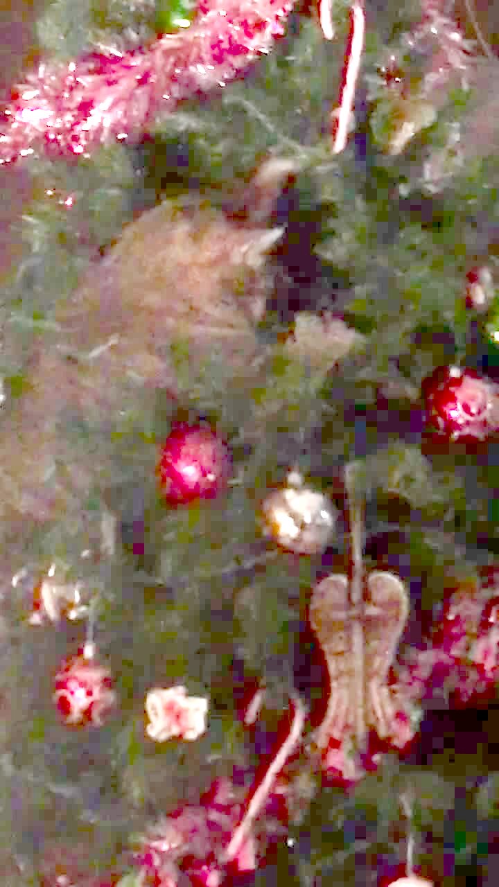 A cat sneaks up on a Christmas Tree toy indoors. The toy has a motion sensor that turns it on, so when the cat gets close, the face on the tree comes alive and it sings Christmas songs and the cat runs away scared. AA: Christmas