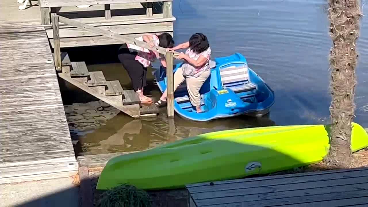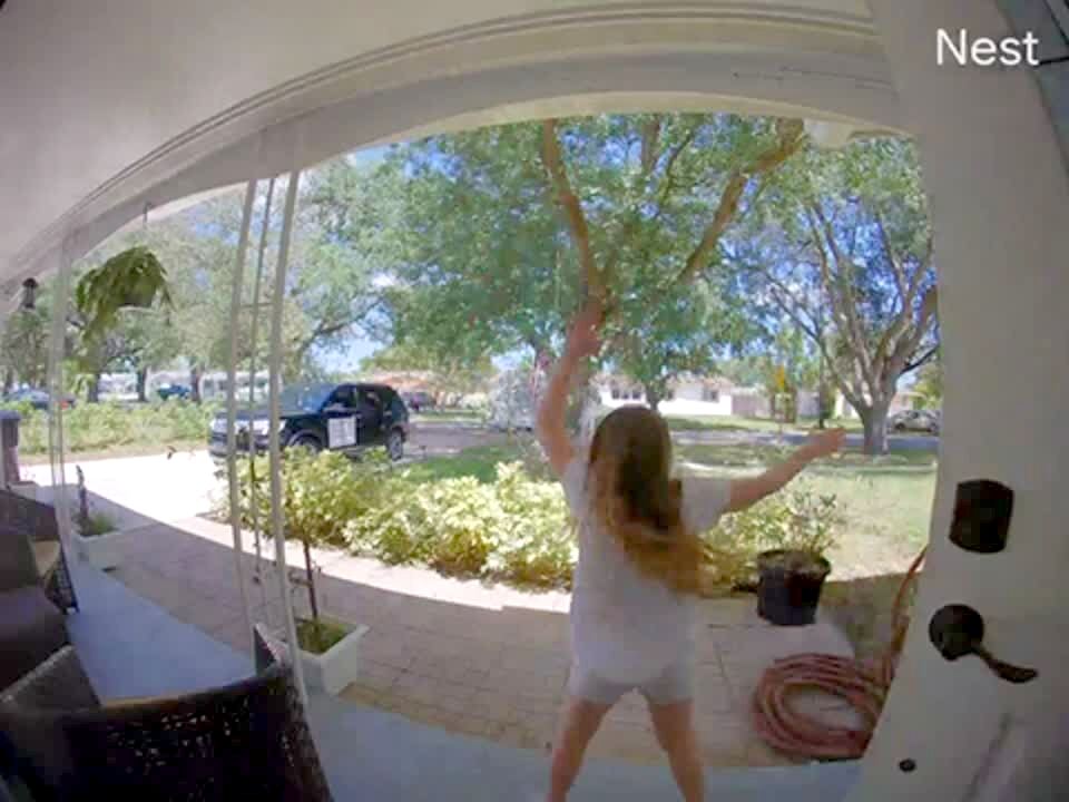 A woman says "hey" when she sees an orange cat in a room on a security camera, which causes the cat to back up and jump out of sight. Security footage.