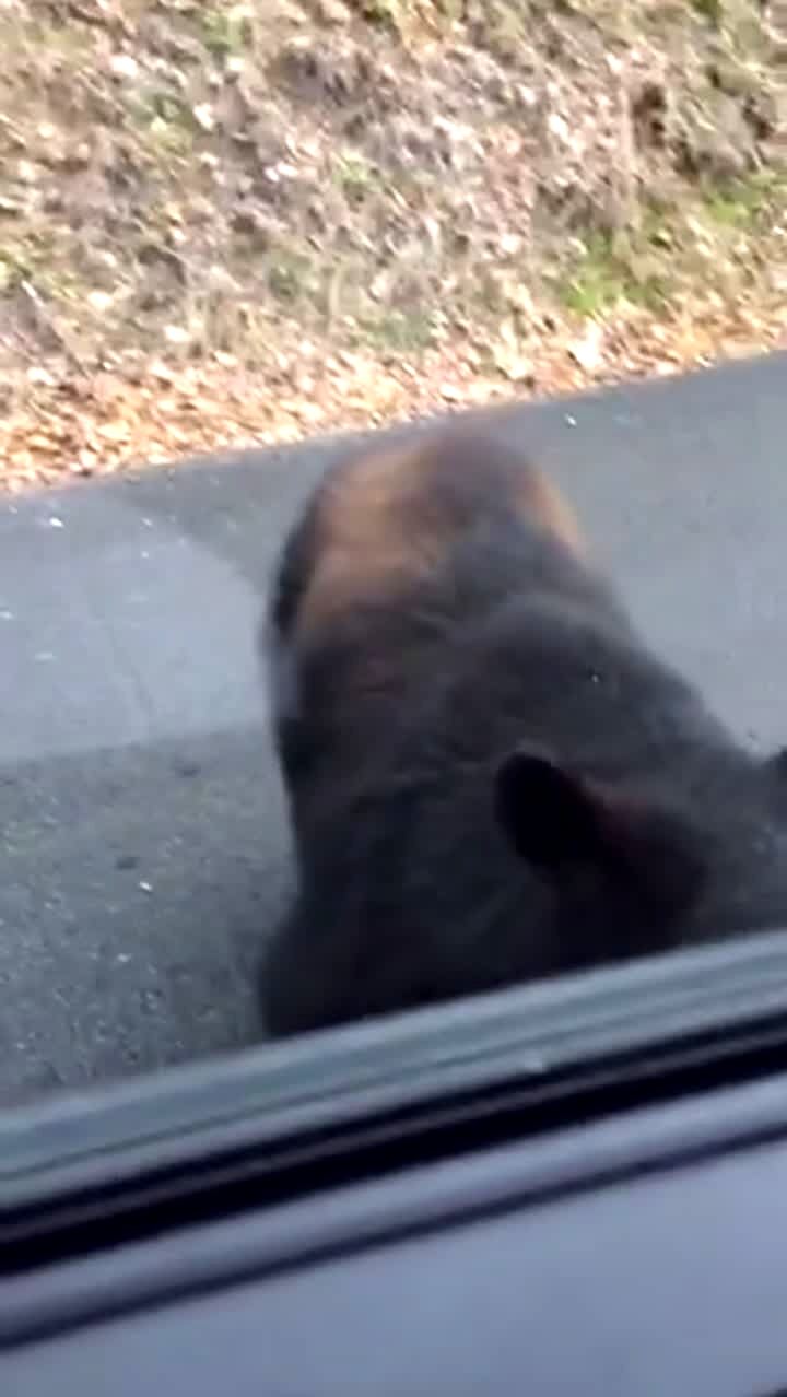 Man films bears in the pond from his car, another brown bear suddenly appears and scares man, biting at his side mirror.
