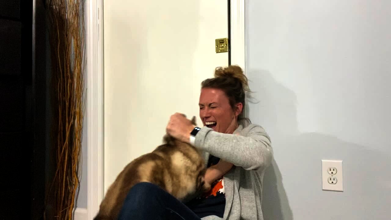 A woman greets a herd of deer in a yard, then her dog chases them away.