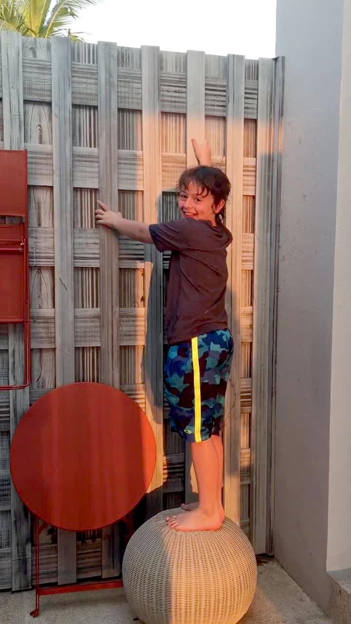 A young boy climbs a fence and falls down and lands on his butt as he tries to demonstrate how to break into a hotel room.